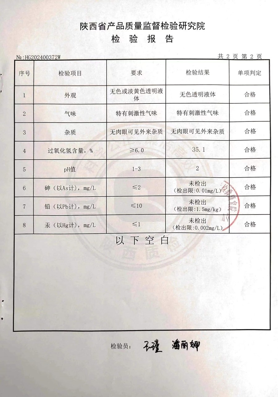 過氧化氫消毒液(食品級雙氧水)檢測報告(2024年度)