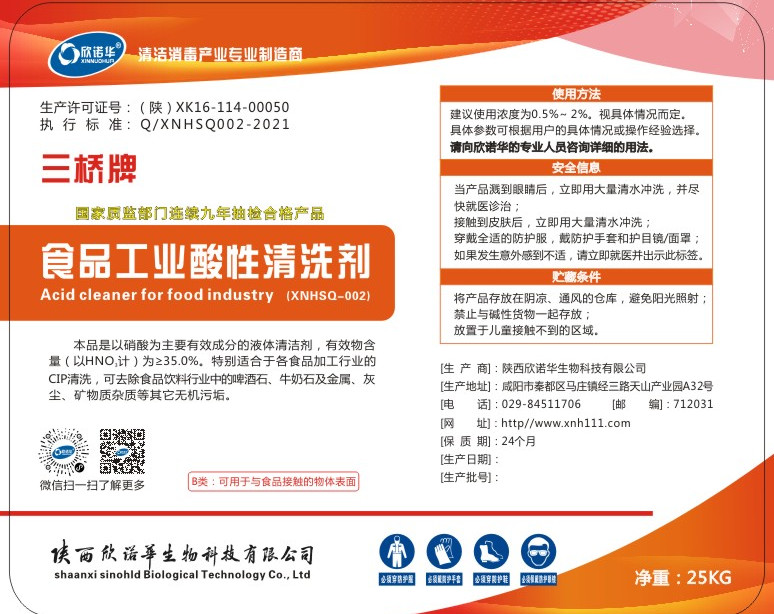食品設(shè)備清洗劑酸性(三橋牌)產(chǎn)品名稱:三橋牌食品工業(yè)酸性清洗劑,含量30%~60%,陜西欣諾華生物科技有限公司生產(chǎn),產(chǎn)品說(shuō)明:三橋牌食品工業(yè)酸性清洗劑(XNHSQ-2型)是以硝酸為主要有效成分的液體清潔劑,有效成份為35~60%,特別適合用于食品、飲料、乳品、啤酒等行業(yè)設(shè)備,容器、管道的CIP清洗使用