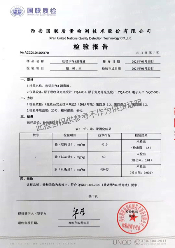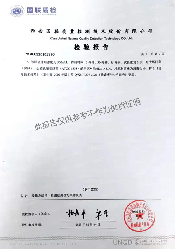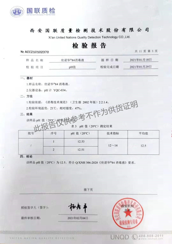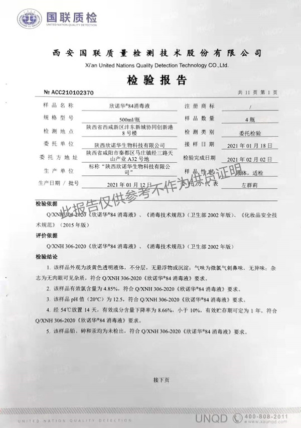 欣諾華84消毒液(XNH306型)檢測報告(2021年度)-陜西欣諾華生物科技有限公司
