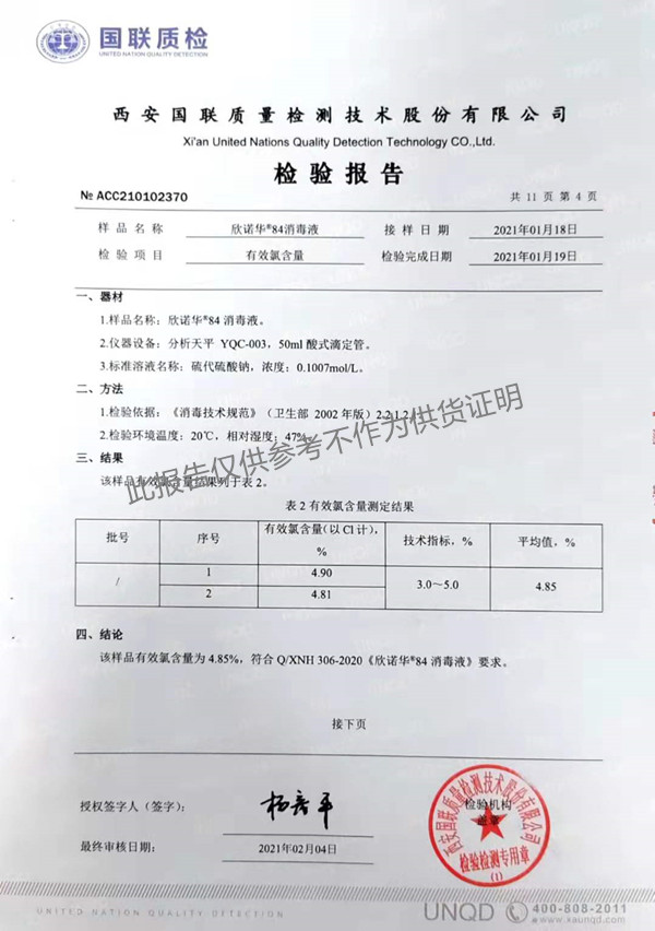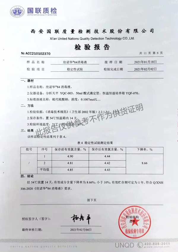欣諾華牌次氯酸鈉消毒液(XNH004型)檢測報告