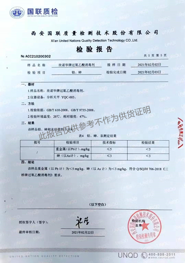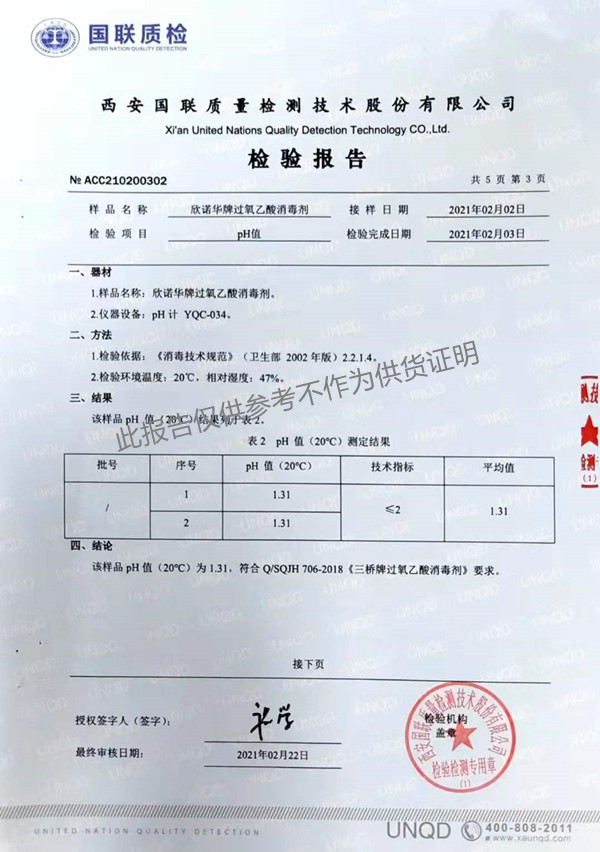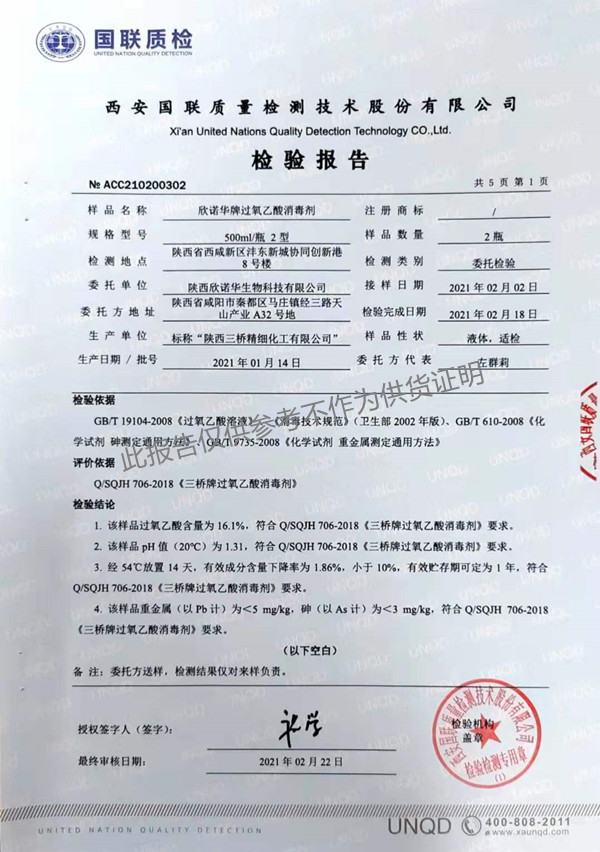 欣諾華牌過氧乙酸消毒劑(SQ-706型)檢測(cè)報(bào)告(2021年度)-陜西欣諾華生物科技有限公司