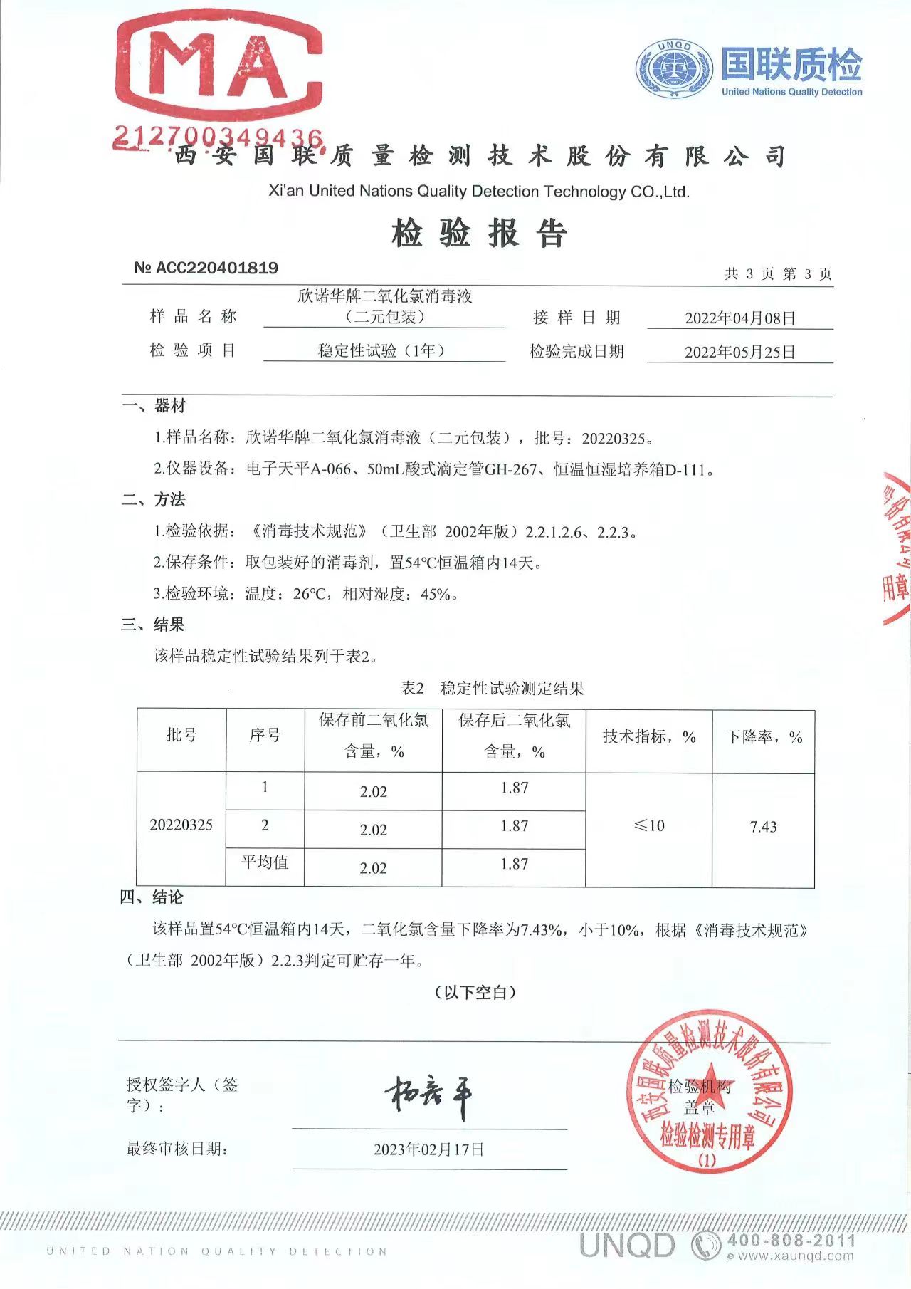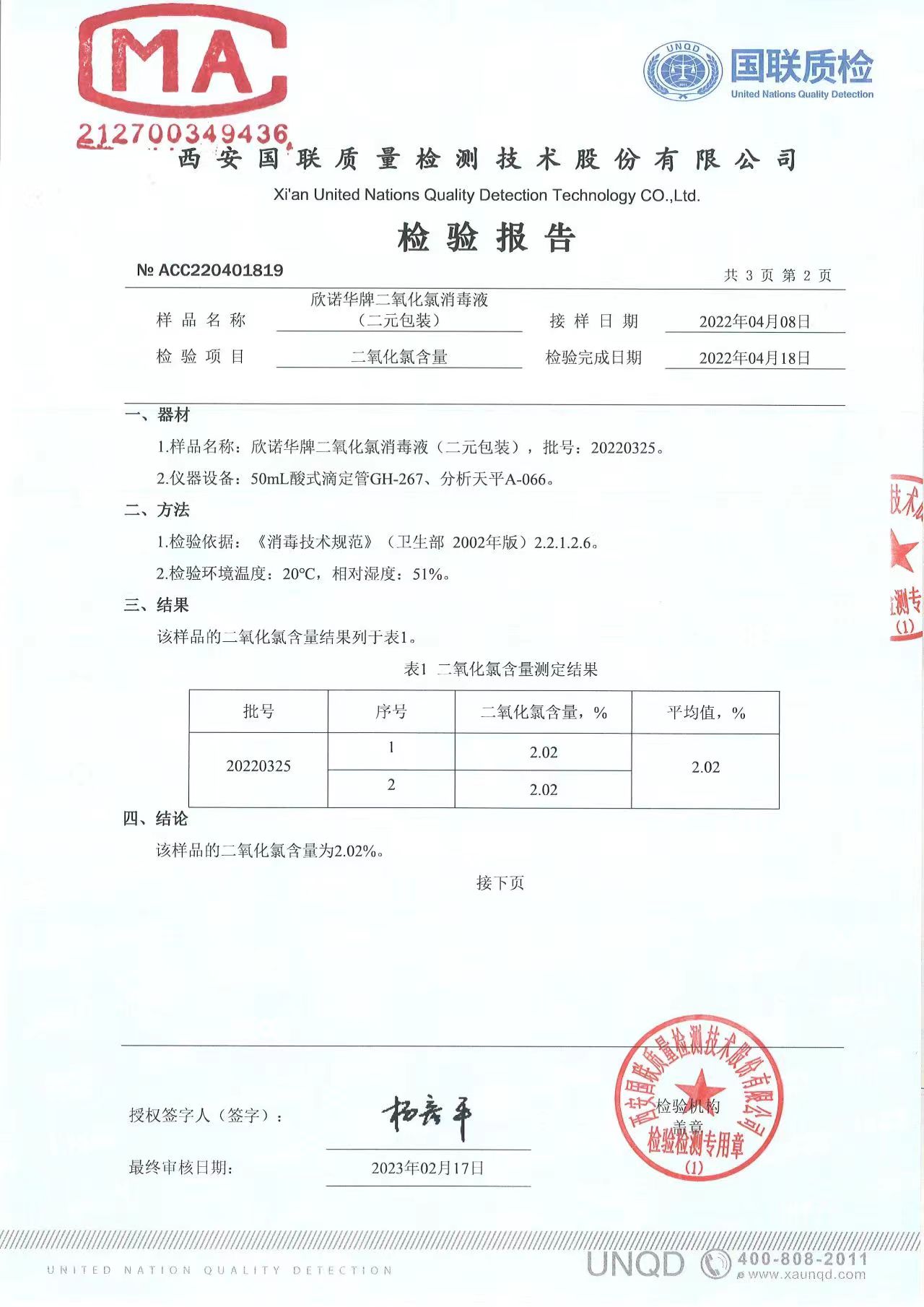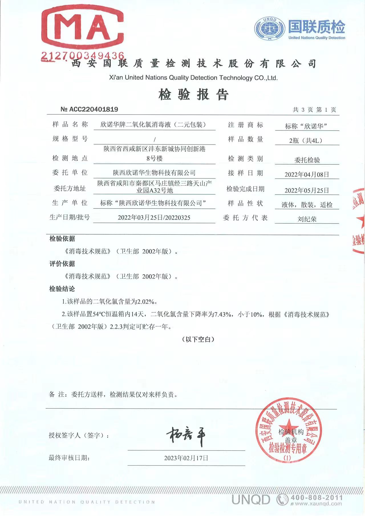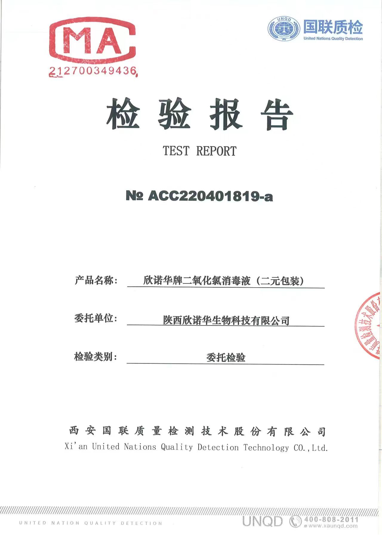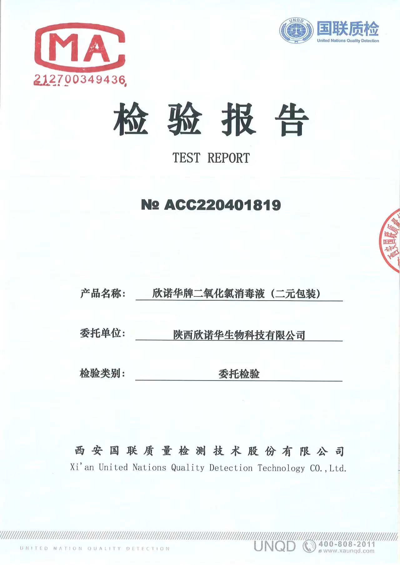 二氧化氯消毒液(商品名稱:欣諾華牌二氧化氯消毒液)第三方檢測(cè)報(bào)告,本品是以二氧化氯為主要有效成分的消毒液,主要用于生活飲用水消毒,二次供水消毒。含量:2.0%,生產(chǎn)商;陜西欣諾華生物科技有限公司,服務(wù)熱線:13991111706(微信同號(hào))